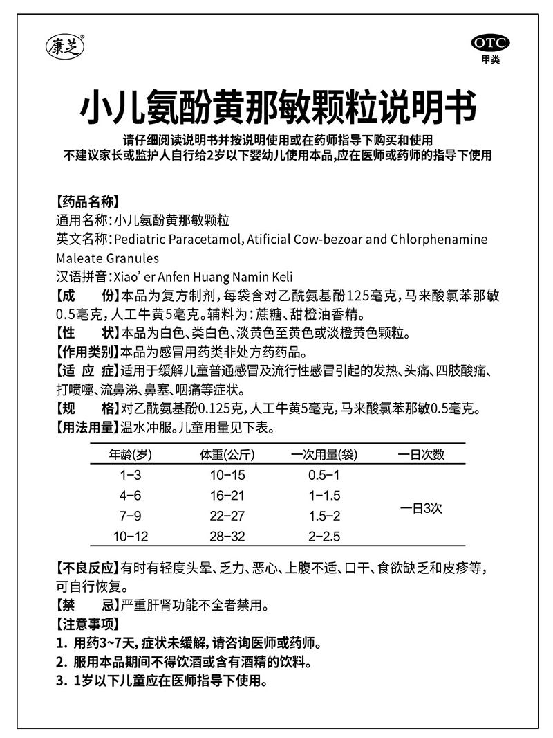 1.12袋/盒; 2.用于緩解兒童普通感冒及流行性感冒引起的發熱、頭痛、四肢酸痛、打噴嚏、流鼻涕、鼻塞、咽痛等癥狀。
