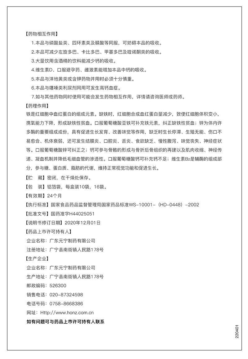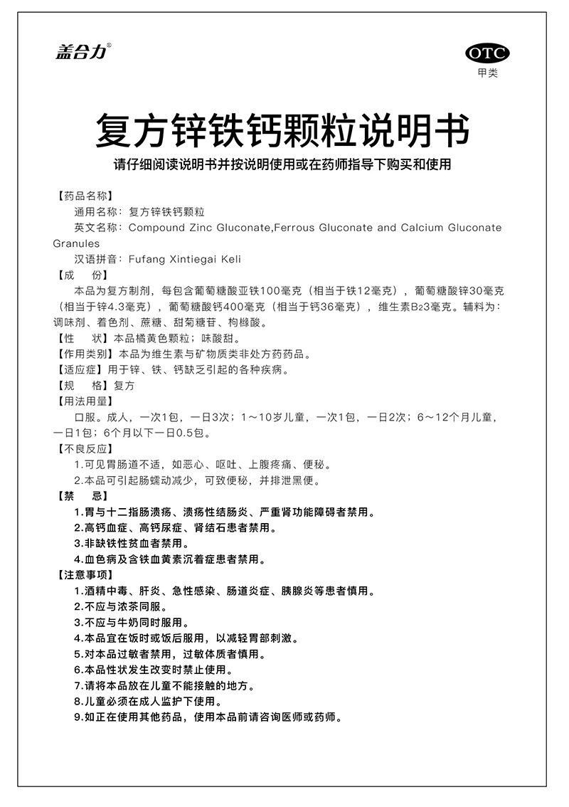 1、10袋裝;16袋裝。復方制劑,每包含葡萄糖酸亞鐵100毫克(相當于鐵12毫克)、葡萄糖酸鋅30毫克(相當于鋅4.3毫克)、葡萄糖酸鈣400毫克(相當于鈣36毫克)、維生素B23毫克; 2、用于鋅、鐵、鈣缺乏引起的各種疾病。