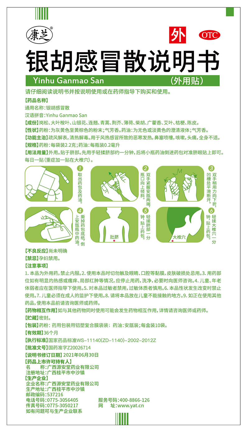 1、 2貼;3貼;5貼;10貼; 2、銀胡感冒散研制于1996年源安堂藥業,其組方出自《溫病條辨》—“銀翹散”基礎上加減,并巧妙加入壯醫特色藥材崗松、大葉桉葉、青蒿、荊芥等富含揮發油藥材,通過獨特制備工藝將揮發油精制成藥油,形成創新藥粉+藥油混合的給藥方式,制成屬于散劑的外用貼,在治療感冒發燒領域獨樹一幟,開創先河